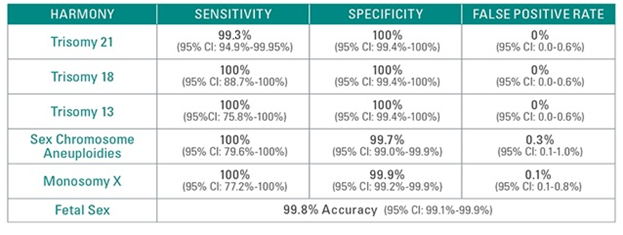 بالاترین نرخ تشخیص: هیچکدام از دیگر روشهای NIPT به اندازه روش هارمونی مورد ارزیابی های بالینی گسترده قرار نگرفته است . در مجموع 362 مورد نتیجه غربالگری مثبت برای سندرم داون از جمعیت زنان مورد مطالعه 361 مورد با روشهای تشخیصی تایید شد و تنها یک مورد مثبت کاذب وجود داشت ( به عنوان مثال نرخ تشخیص 99.7%)