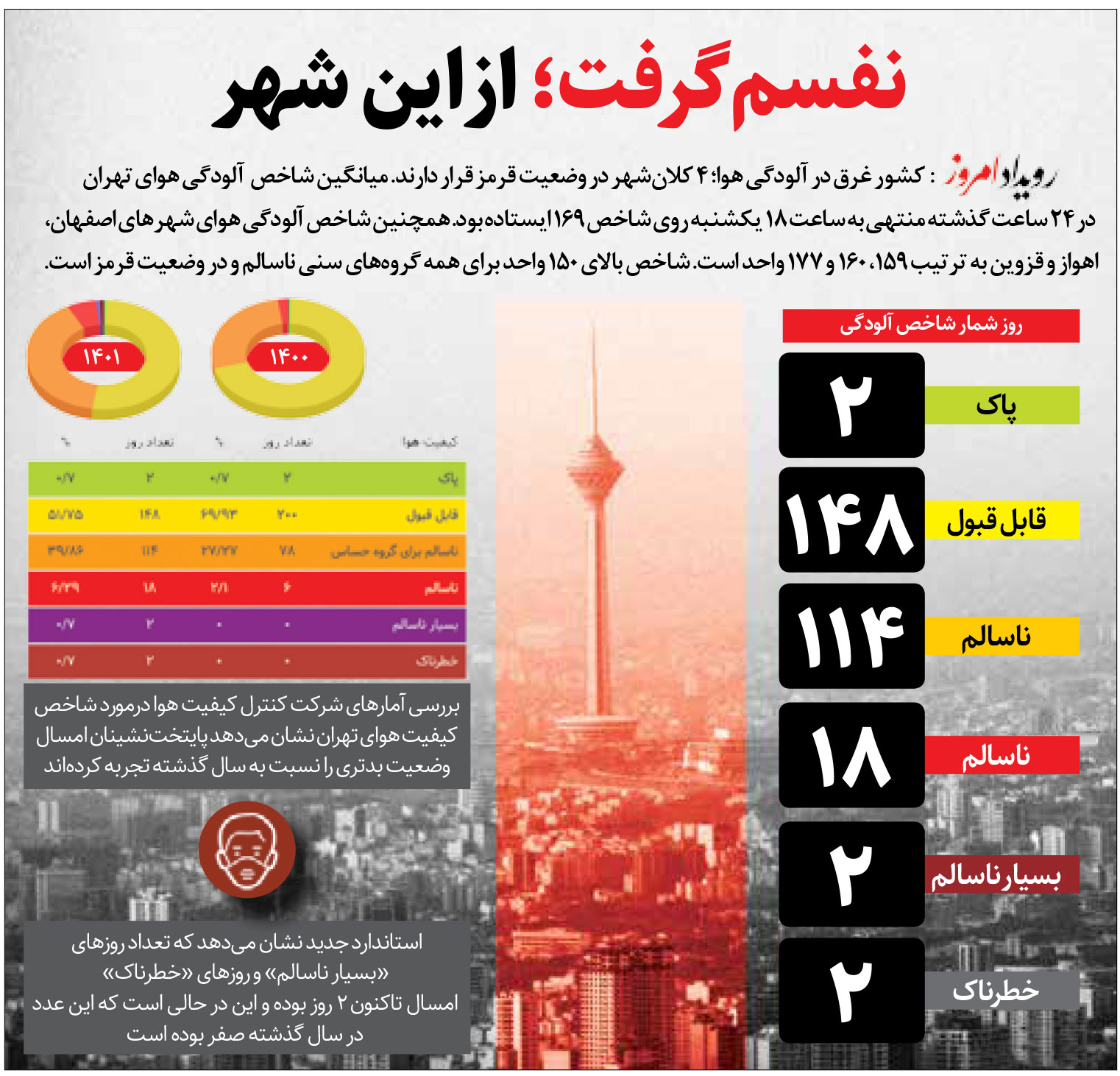 همچنین شاخص آلودگی هوای شهرهای اصفهان، اهواز و قزوین به ترتیب 159، 160 و 177 واحد است. ️شاخص بالای ۱۵۰ واحد برای همه گروههای سنی ناسالم و در وضعیت قرمز است.