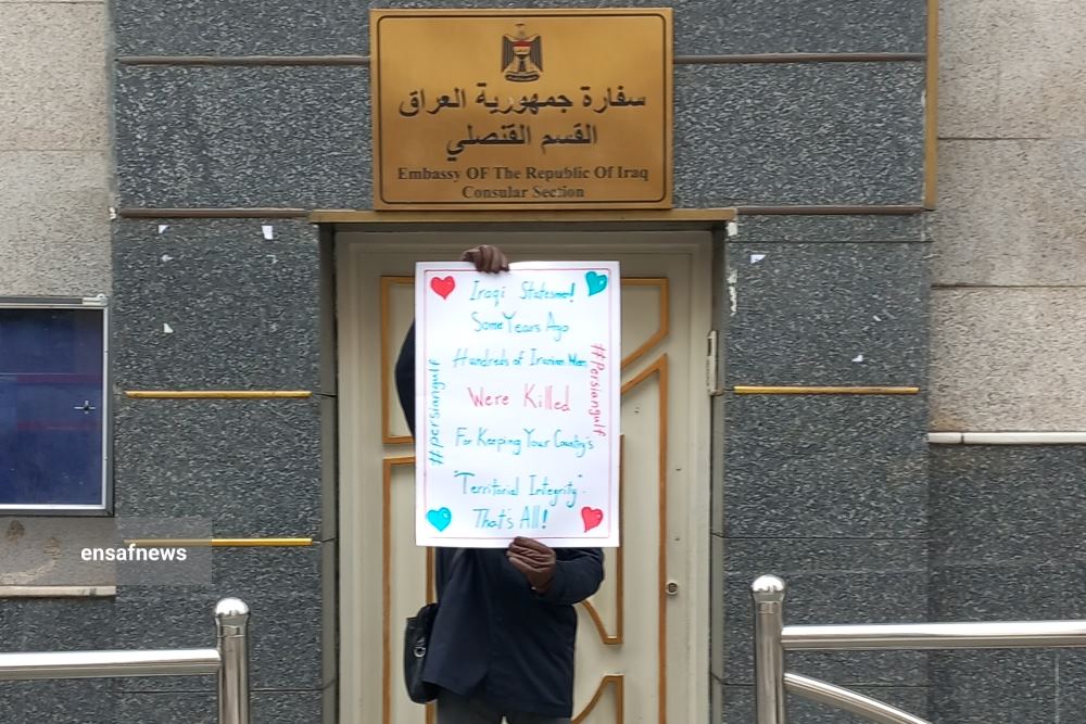 یکی از شهروندان ایرانی روز سه‌شنبه در مقابل سفارت کشور عراق در تهران ایستاد و نوشته‌ای اعتراضی نسبت به استفاده‌ی دولتمردان آن کشور از نام جعلی برای خلیج فارس در دست گرفت.