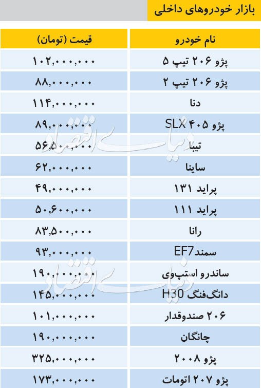 روزنامه دنیای اقتصاد در دو جدول جداگانه، قیمت انواع خودروهای تولید کارخانجات داخلی و نیز چند برند فرانسوی،کره ای و... را منتشر کرده است.