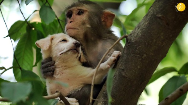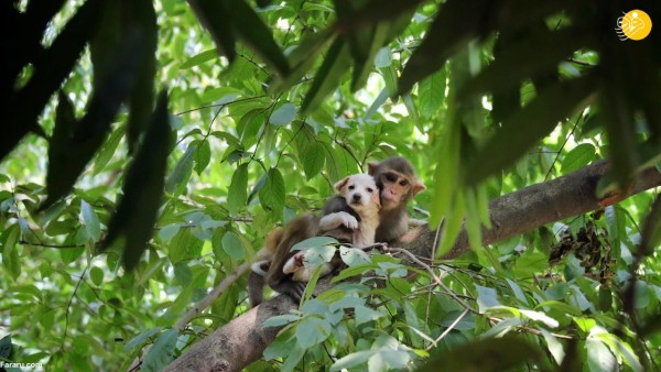میمون سگ کوچک را روی پاهای خود حمل کرده و در حال پریدن از شاخههای درخت دیده شد.