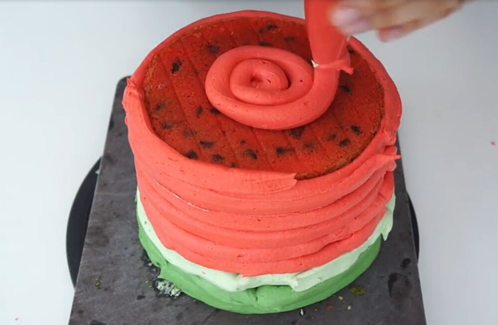 خامه های رنگی را در قیف یکبار مصرف بریزید و دورتا دور کیک دو لایه خامه سبز تیره از پایین کیک، یک لایه خامه سبز روشن و بعد چند لایه خامه صورتی تا بالای کیک و روی کیک بمالید