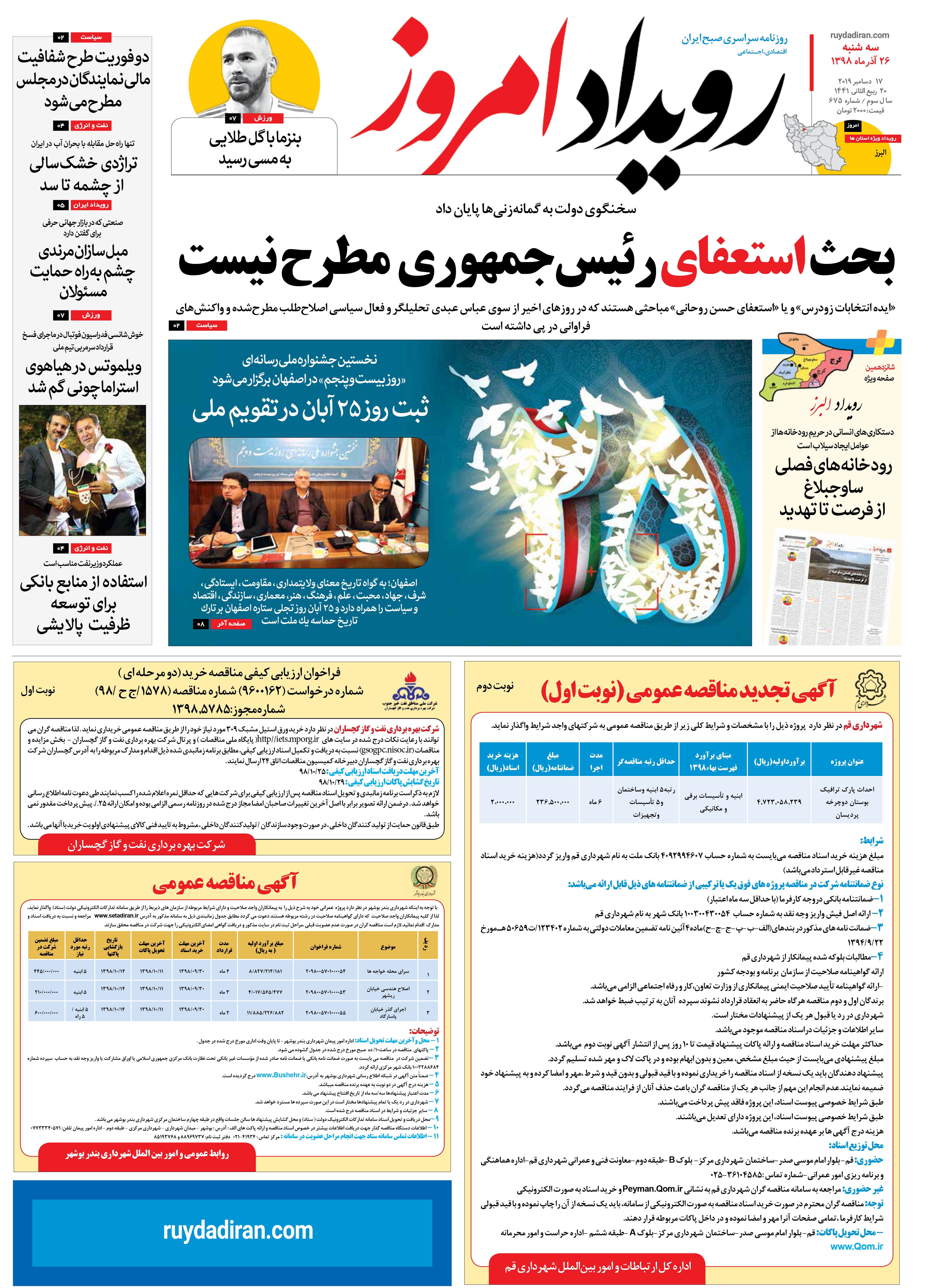 روزنامه رویداد امروز سه‌شنبه 2۶ آذر ۱۳۹۸