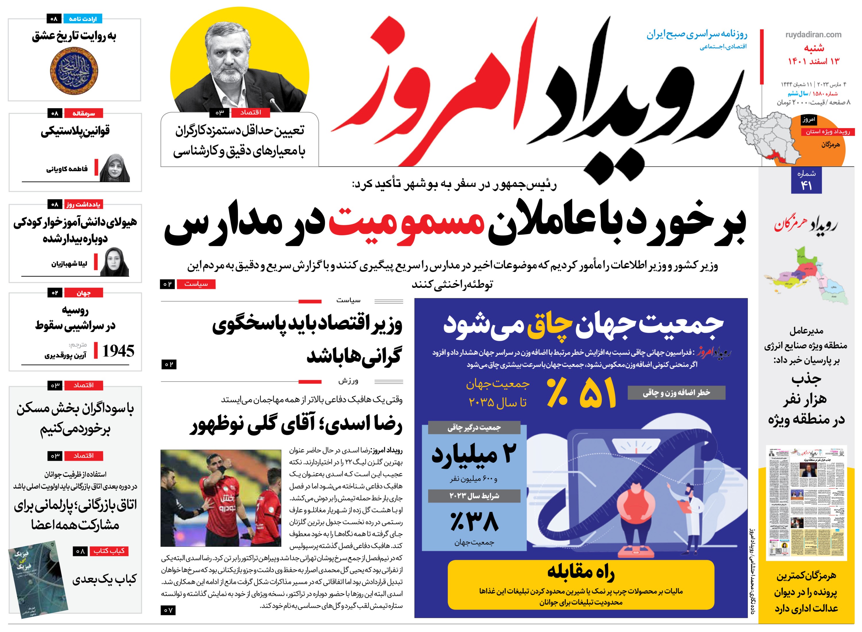 کد: 199524 | 13 اسفند 1401 ساعت 00:00 روزنامه رویداد امروز شنبه ۱۳ اسفند ۱۴۰۱ اشتراک گذاری گزارش خطا × اشتراک گذاری مطلب: روزنامه رویداد امروز شنبه ۱۳ اسفند ۱۴۰۱ فیسبوک اینستاگرام تلگرام ایکس (توییتر) ایتا بله روبیکا × گزارش خطا برای گزارش خطا با پست الکترونیکی: ruydadiran[at]gmail.com در ارتباط باشید