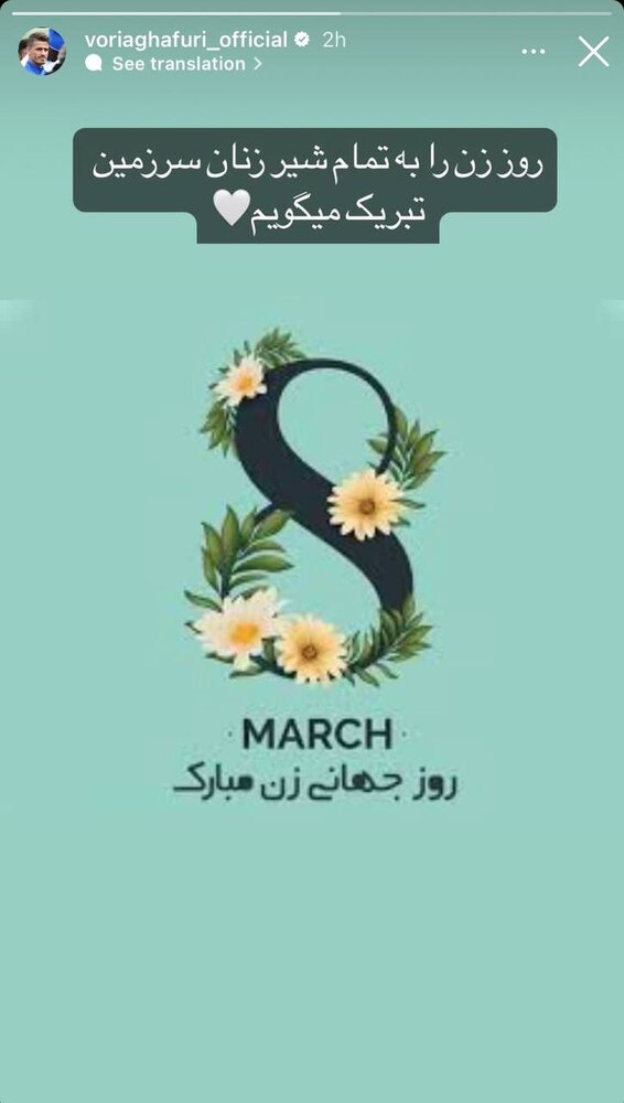 به گزارش رویداد ایران و به نقل از خبرآنلاین؛ امروز 8 مارس در تقویم میلادی به عنوان روز جهانی زن شناخته می شود. وریا غفوری بازیکن اسبق تیم ملی و استقلال با انتشار یک استوری این روز را تبریک گفت.