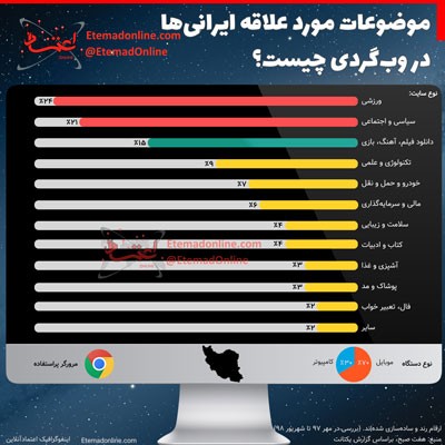 کد: 20767 | 10 دی 1398 ساعت 11:50 موضوعات مورد علاقه ایرانیها در وبگردی چیست؟ یک گزارش منتشرشده نشان میدهد ایرانیها بیشتر به سایتهای ورزشی، سیاسی و دانلود فیلم و آهنگ سر میزنند. موضوعات مورد علاقه ایرانی ها در وب گردی وب گردی روزنامه اعتماد مطبوعات کشور اشتراک گذاری گزارش خطا × اشتراک گذاری مطلب: موضوعات مورد علاقه ایرانیها در وبگردی چیست؟ فیسبوک اینستاگرام تلگرام ایکس (توییتر) ایتا بله روبیکا × گزارش خطا برای گزارش خطا با پست الکترونیکی: ruydadiran[at]gmail.com در ارتباط باشید