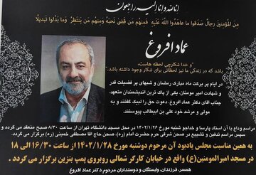- استادان، دانشجویان و دوستان عماد افروغ، جامعهشناس، نویسنده و پژوهشگر، فردا در مسجد دانشگاه تهران با پیکر او وداع میکنند تا در جوار مرقد بنیانگذار جمهوری اسلامی به خاک سپرده شود.