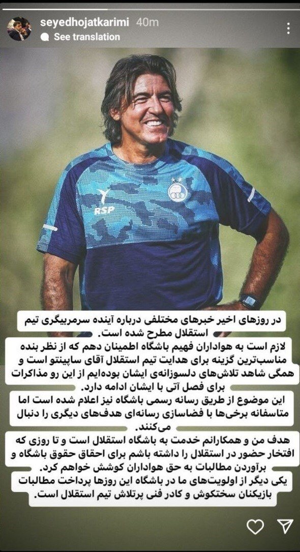 به گزارش رویداد ایران و به نقل از خبرآنلاین، حجت کریمی در صفحه شخصیاش با اشاره به انتشار برخی شایعات درباره مذاکره باشگاه استقلال با برخی گزینهها برای هدایت تیم فوتبال استقلال تاکید کرد مناسبترین گزینه برای سرمربیگری آبیپوشان ریکاردو ساپینتو است.