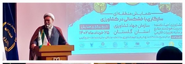 در همایش منطقه ای سازگاری با خشکسالی در کشاورزی؛حجت الاسلام سائری مسوول حوزه نمایندگی ولی فقیه درهمایش منطقه ای سازگاری با خشکسالی در کشاورزی به تبیین ابعاد  حفظ منابع طبیعی از منظر آیات قران کریم و روایات پرداخت.
