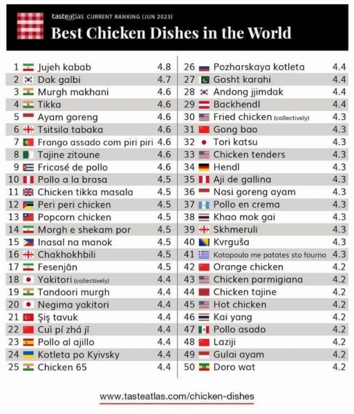 «تیستاطلس یا TasteAtlas» مرجع و راهنمای غذاهای محلی است که دستورالعملهای معتبر، نظرات منتقدان غذا و مقالات تحقیقاتی درباره مواد اولیه و غذاهای محبوب را گردآوری میکند. در ادامه فهرست کامل 50 غذای برتر مرغی جهان را می خوانید:
