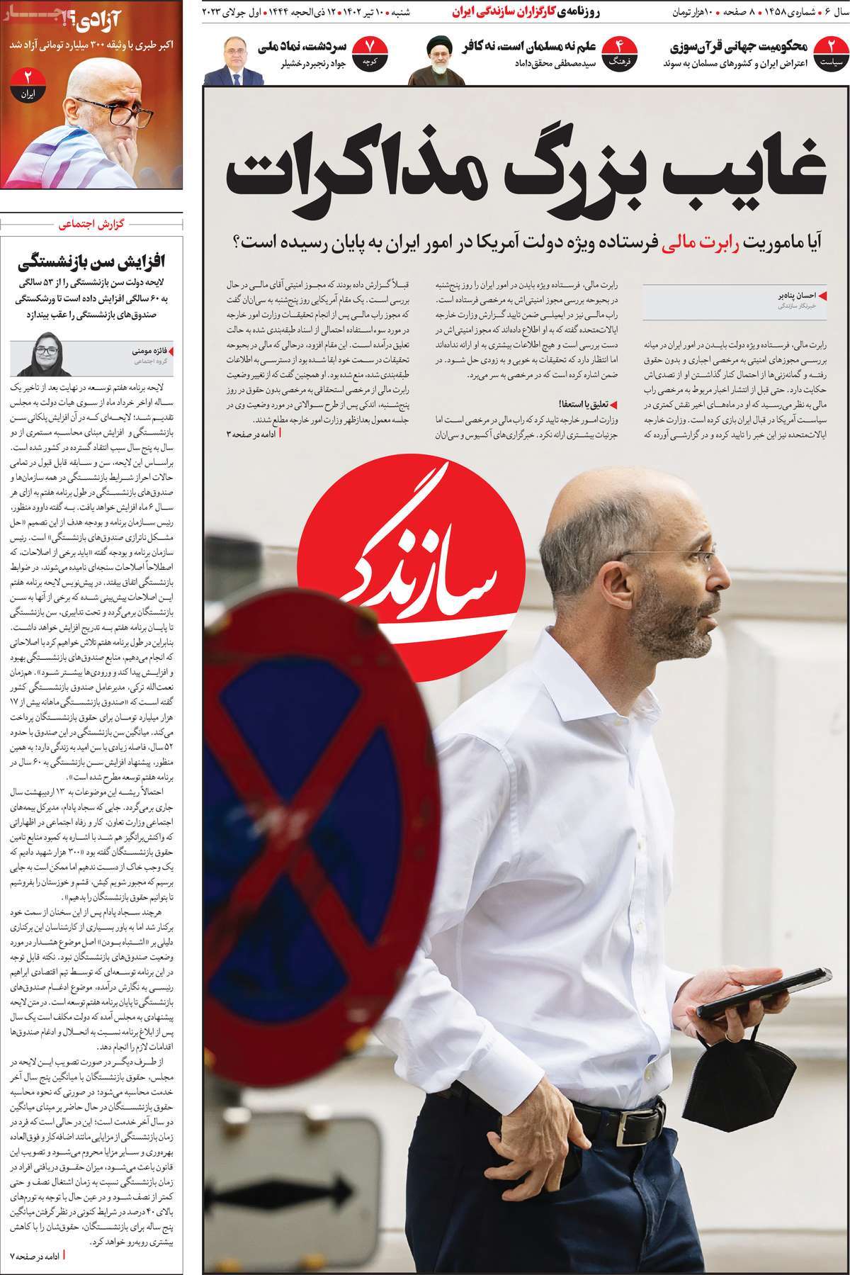 صفحه نخست امروز روزنامه سازندگی