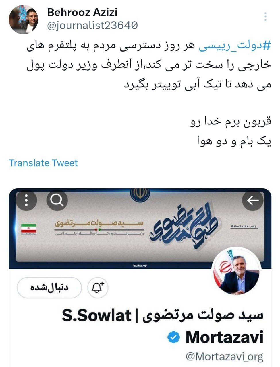 دولت از یک طرف هر روز فیلترینگ را تشدید می کند و از سوی دیگر وزیر کار دولت رئیسی تیک آبی توییتر می خرد!
