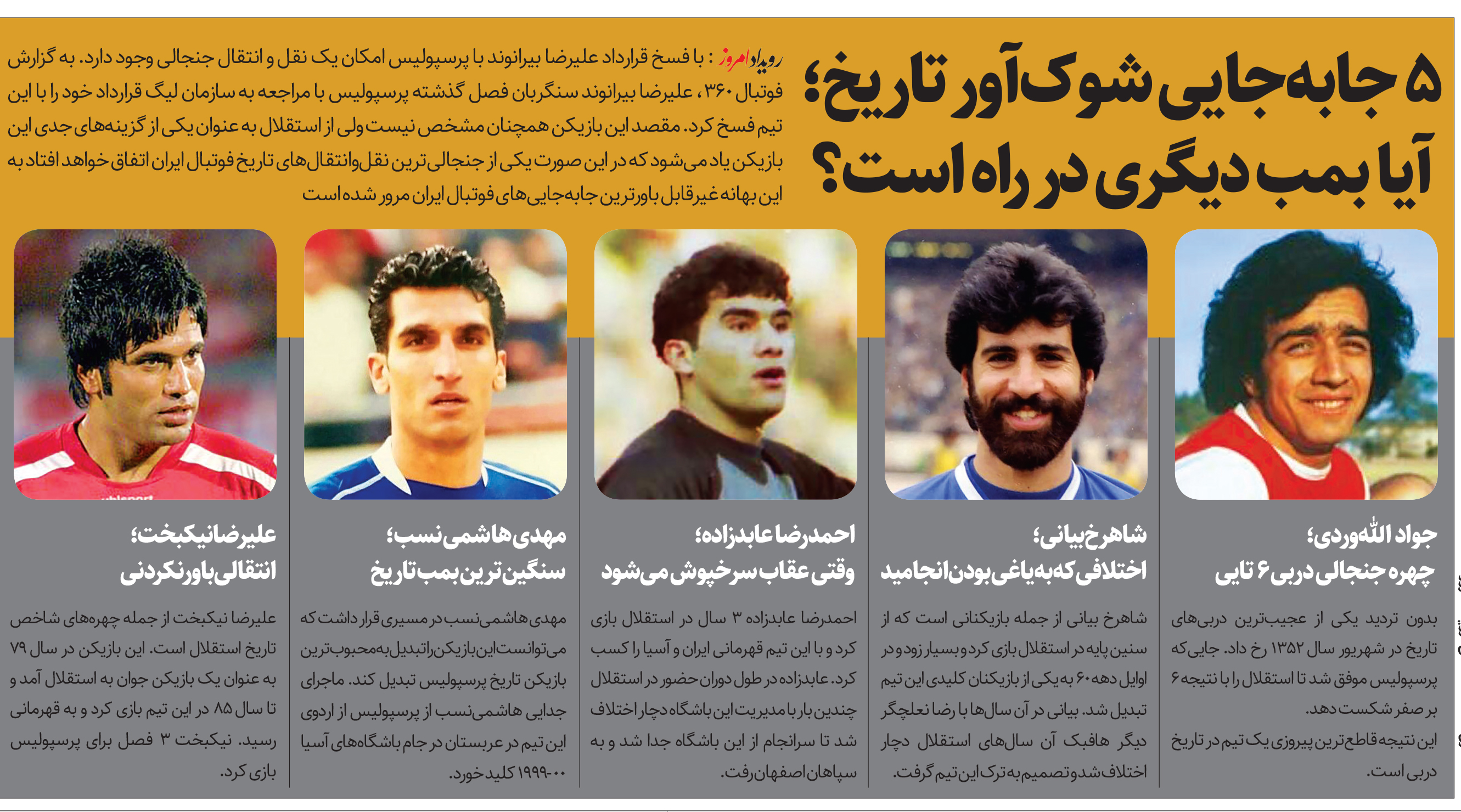 با فسخ قرارداد علیرضا بیرانوند با پرسپولیس امکان یک نقل و انتقال جنجالی وجود دارد. به گزارش فوتبال 360، علیرضا بیرانوند سنگربان فصل گذشته پرسپولیس با مراجعه به سازمان لیگ قرارداد خود را با این تیم فسخ کرد. مقصد این بازیکن همچنان مشخص نیست ولی از استقلال به عنوان یکی از گزینه‌های جدی این بازیکن یاد می‌شود که در این صورت یکی از جنجالی‌ترین نقل‌و‌انتقال‌های تاریخ فوتبال ایران اتفاق خواهد افتاد به این بهانه غیرقابل باورترین جابه‌جایی‌های فوتبال ایران مرور شده است.