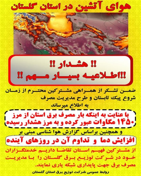 با عنایت به اینکه بار مصرف برق استان از مرز ۱۴۵۰ مگاوات عبور کرده و به مرز هشدار رسیده و همچنین براساس گزارش هوا شناسی مبنی بر افزایش دما و تداوم آن در روزهای آینده،از مشترکین فهیم استان تقاضا داریم خدمتگزاران خود در شرکت توزیع برق گلستان را با مدیریت مصرف برق جهت پایداری شبکه یاری نمایند