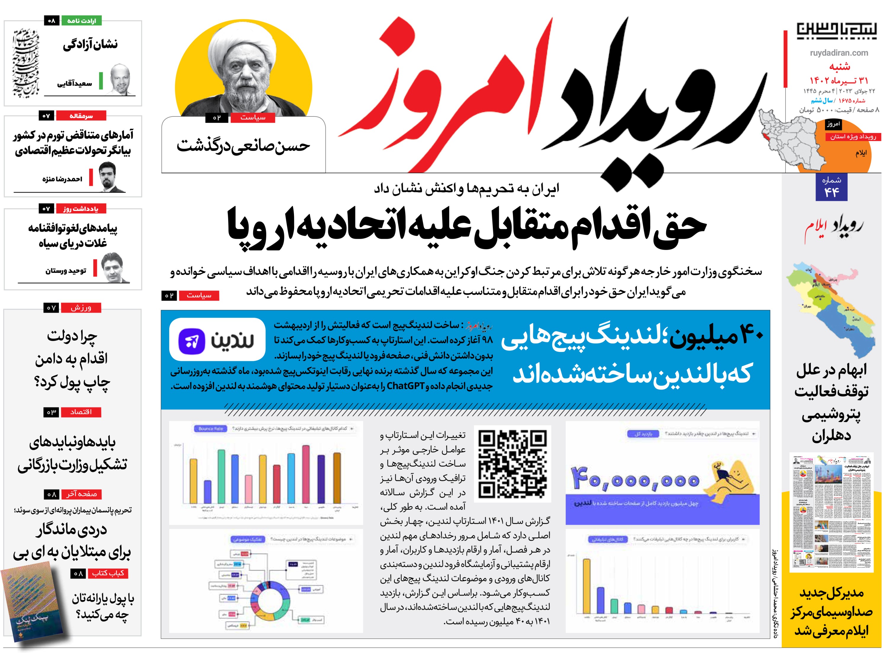 کد: 228634 | 31 تیر 1402 ساعت 02:05 روزنامه رویداد امروز شنبه ۳۱ تیر ۱۴۰۲ اشتراک گذاری گزارش خطا × اشتراک گذاری مطلب: روزنامه رویداد امروز شنبه ۳۱ تیر ۱۴۰۲ فیسبوک اینستاگرام تلگرام ایکس (توییتر) ایتا بله روبیکا × گزارش خطا برای گزارش خطا با پست الکترونیکی: ruydadiran[at]gmail.com در ارتباط باشید