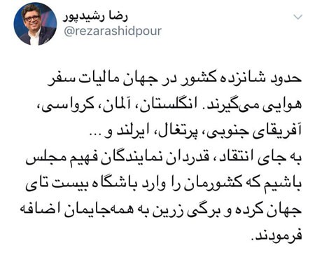 کد: 22929 | 02 بهمن 1398 ساعت 09:38 کنایه رشیدپور به نمایندگان درباره عوارض خروج رشیدپور؛ مجری تلویزیونی به مصوبه نمایندگان مجلس درباره اخذ مالیات برای خروج از کشور واکنش نشان داد. رضا رشیدپور اخذ مالیات برای خروج از کشور اشتراک گذاری گزارش خطا × اشتراک گذاری مطلب: کنایه رشیدپور به نمایندگان درباره عوارض خروج فیسبوک اینستاگرام تلگرام ایکس (توییتر) ایتا بله روبیکا × گزارش خطا برای گزارش خطا با پست الکترونیکی: ruydadiran[at]gmail.com در ارتباط باشید