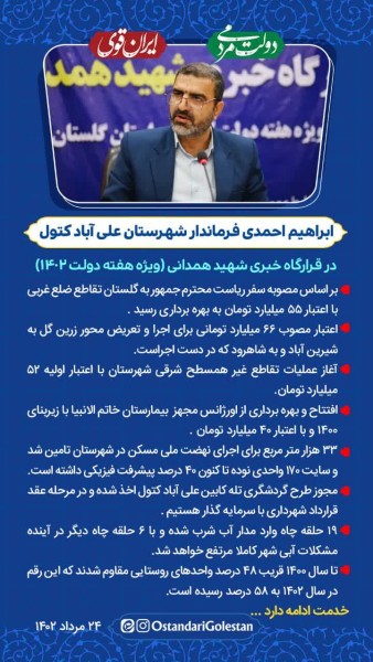 فرماندار علی آبادکتول، تامین ۳۲ هزار مترمربع در قالب طرح نهضت ملی مسکن، کلنگ زنی گردشگری مجتمع خدماتی در دهه زرین گل و محمد آباد، حفر ۱۹ حلقه چاه آب شرب، افزایش ۱۰ درصدی مقاوم سازی مسکن، پرداخت هزار و ۲۰۰ فقره تسهیلات مسکن روستایی، ۱۲۰ هزار متر مربع آسفالت معابر روستایی، مطالعه و اختصاص ۶۶ میلیارد تومان برای ساخت جاده علیآبادکتول به شاهرود را از جمله اقدامات ۲ سال اخیر دولت سیزدهم در این شهرستان برشمرد.