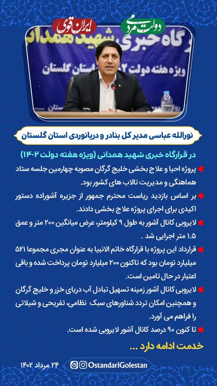 وی بیان کرد: اجرای پروژه علاجبخشی خلیج گرگان به عنوان یکی از مصوبات سفر اول رییس جمهور و مطالبه بهحق مردم استان به پیشرفت ۹۰ درصدی رسید.