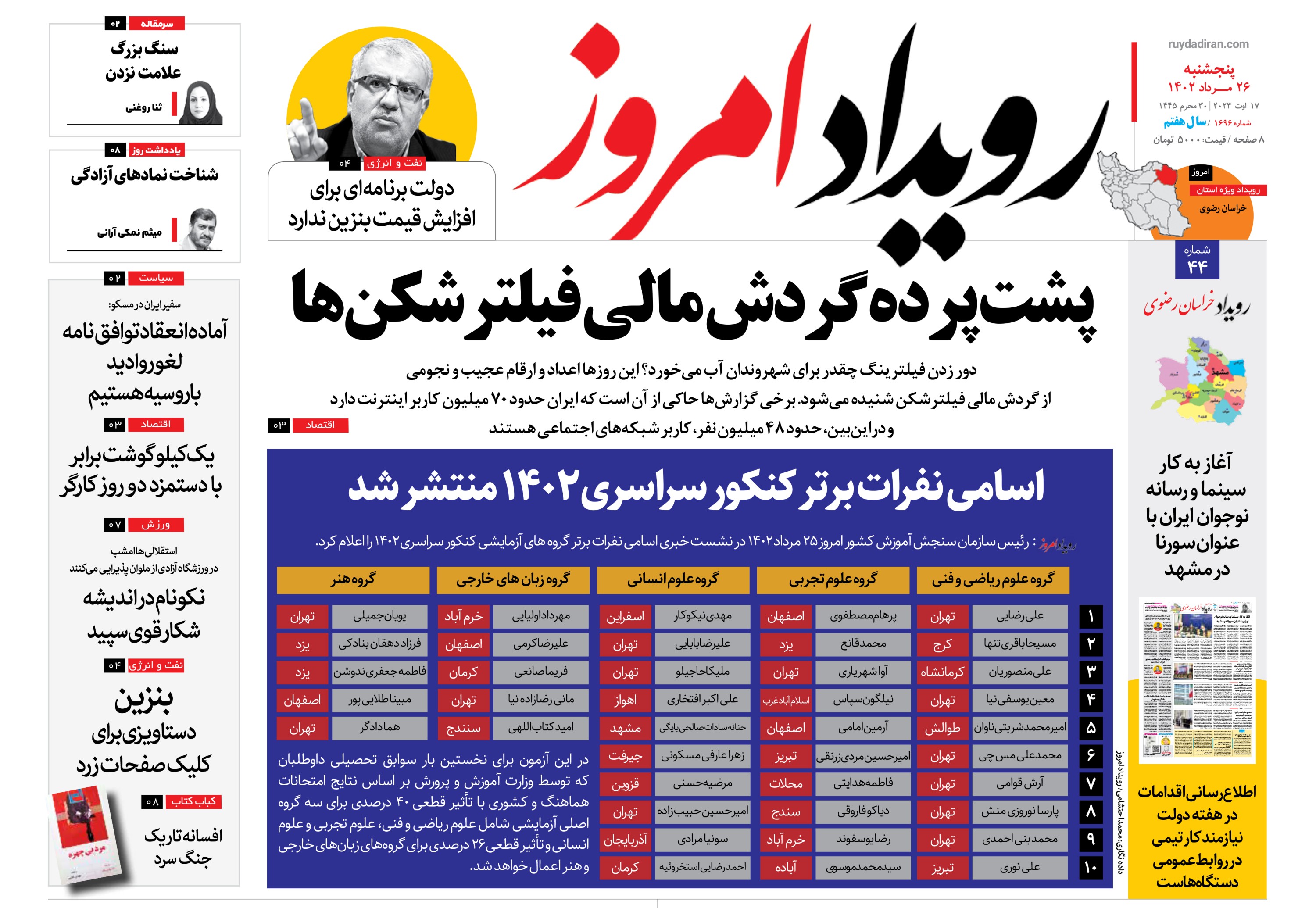 روزنامه رویداد امروز پنج شنبه ۲۶ مرداد ۱۴۰۲