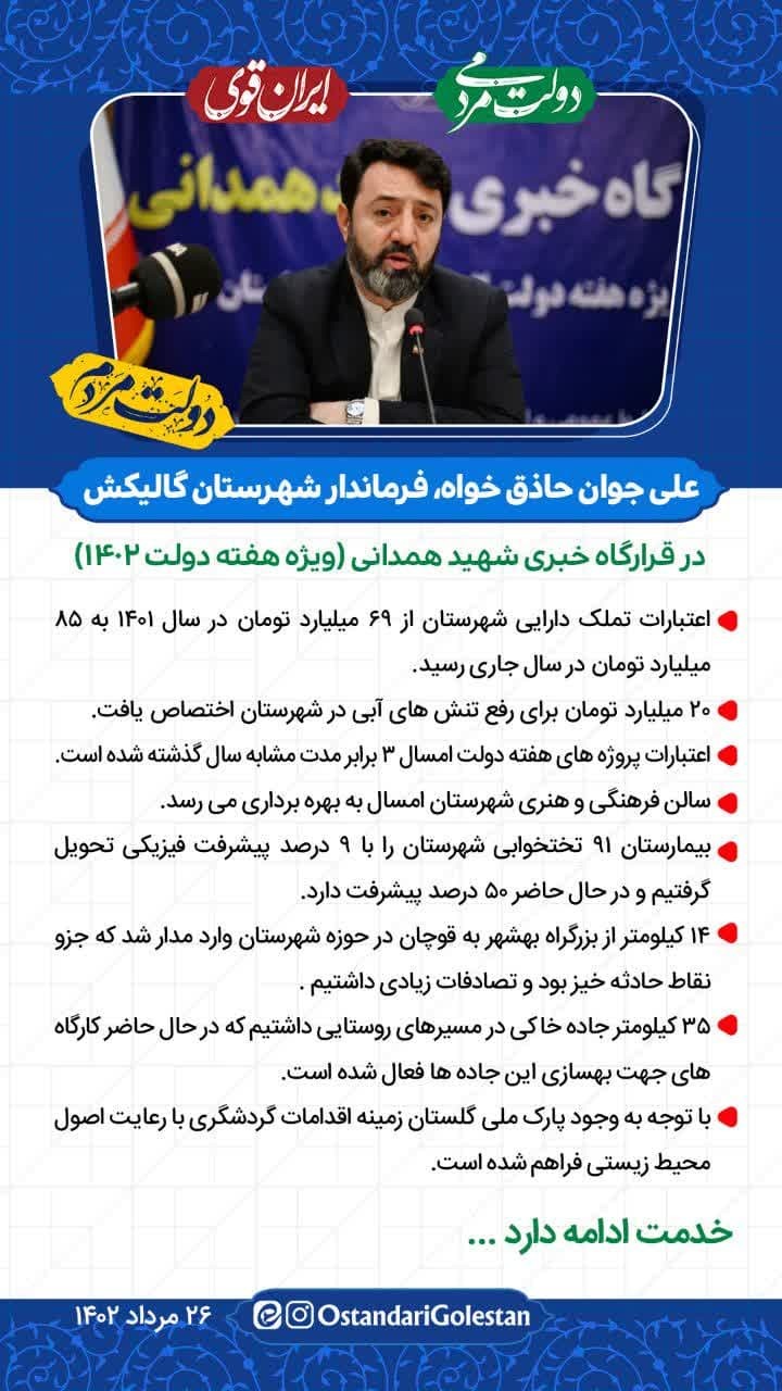 فرماندار گالیکش گفت: پایان عملیات توسعه راههای ارتباطی و گازرسانی روستایی در گالیکش سال ۱۴۰۳ دیده شده است.