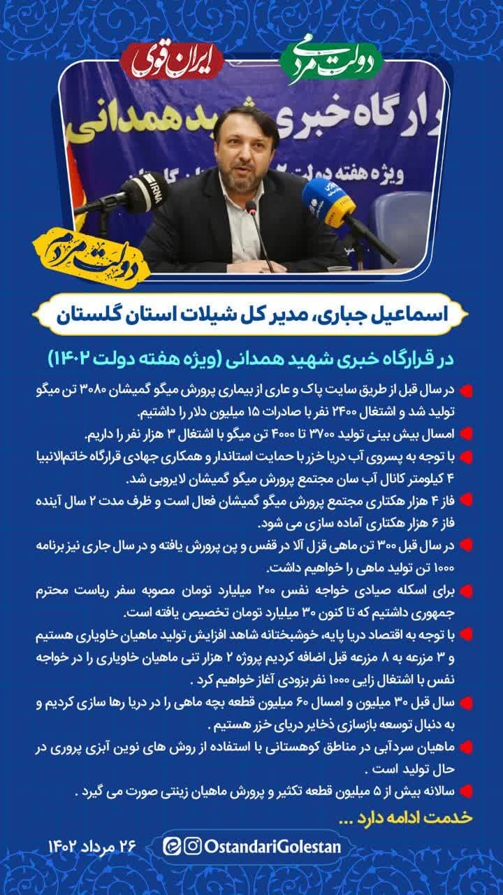 مدیر کل شیلات استان گلستان بیان کرد: در سال قبل از طریق سایت پاک و عاری از بیماری پرورش میگو گمیشان ۳۰۸۰ تن میگو تولید شد و اشتغال ۲۴۰۰ نفر با صادرات ۱۵ میلیون دلار را داشتیم.