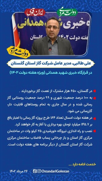 وی اظهار کرد: افتتاح گازرسانی به 154 طرح صنعتی ، 8 پروژه روستایی ، نصب و راه اندازی نیروگاه خورشیدی 25 کیلو وات ، باز چرخانی پساب فاضلاب ساختمان مرکزی گاز گلستان به همراه  کلنگ زنی  احداث ساختمان اداری و پست امداد شهر فراغی را  از برنامه های این شرکت گاز در ایام هفته دولت برشمرد که در مجموع بالغ بر 1457 میلیارد ریال  از محل پروژه های  عمرانی شرکت هزینه شده  است.