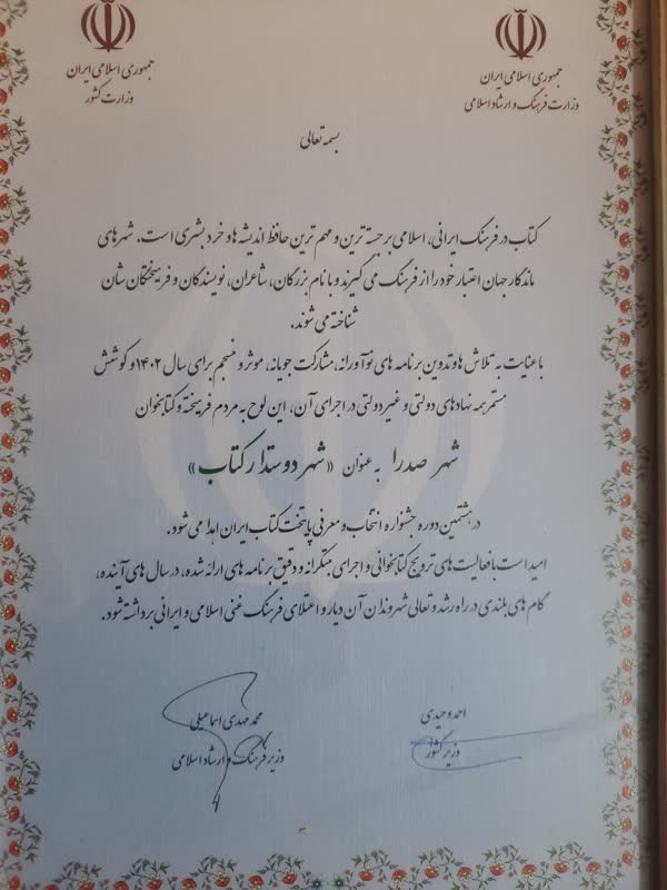 سرپرست شهرداری صدرا با تبریک این موفقیت ملی به اهالی فرهنگمدار صدرا و استان فارس افزود: در این آیین تندیس و لوحی با امضای وزیر کشور و وزیر فرهنگ و ارشاد اسلامی به مردم فرهیخته و کتابخوان صدرا، به عنوان شهر دوستدار کتاب اهدا شد.