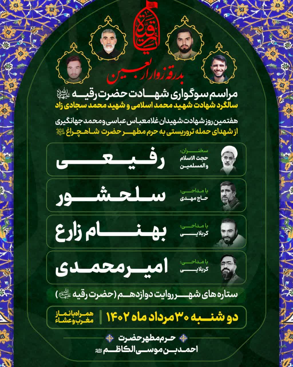 متولی افزود: روایت دوازدهم سلسله برنامه‌های ستاره‌های شهر از نماز مغرب و عشای شامگاه دوشنبه ۳۰ مردادماه جاری در حرم مطهر حضرت احمدبن موسی شاهچراغ (علیه‌السلام) اجرا می‌شود‌.