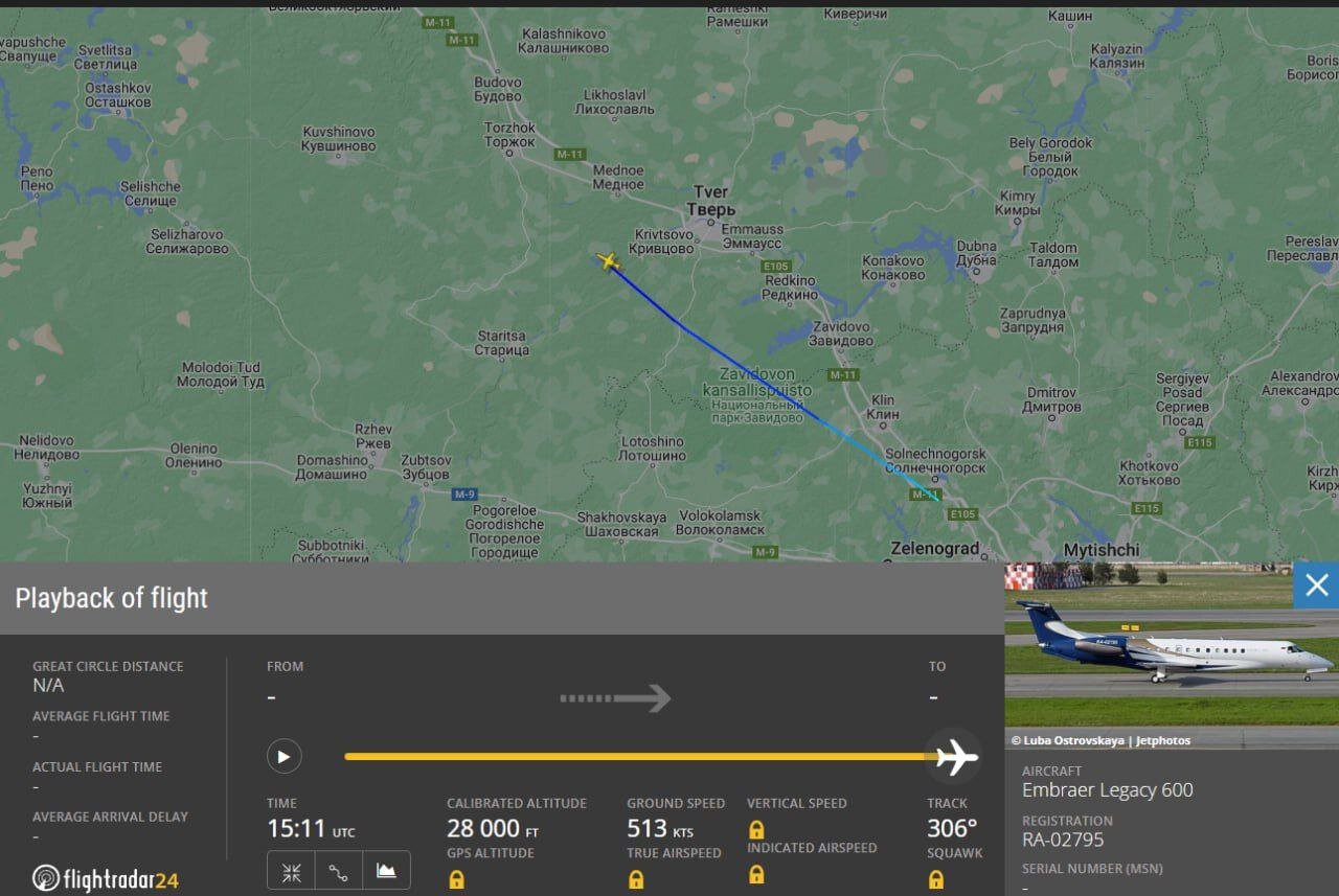 بر اساس اعلام رسانه های روسی ، هواپیمایی که حامل پریگوژین و ۹ سرنشین دیگر بوده یک جت کوچک برزیلی امبرار بوده است. جت Embraer Legacy ۶۰۰ با ریجستری RA-۰۲۷۹۵ که متعلق به یوگنی پرگوژین رهبر مزودران واگنر، در حوالی منطقه تور سقوط کرده است. این هواپیما بار ها در بلاروس هم روئیت شده بود.