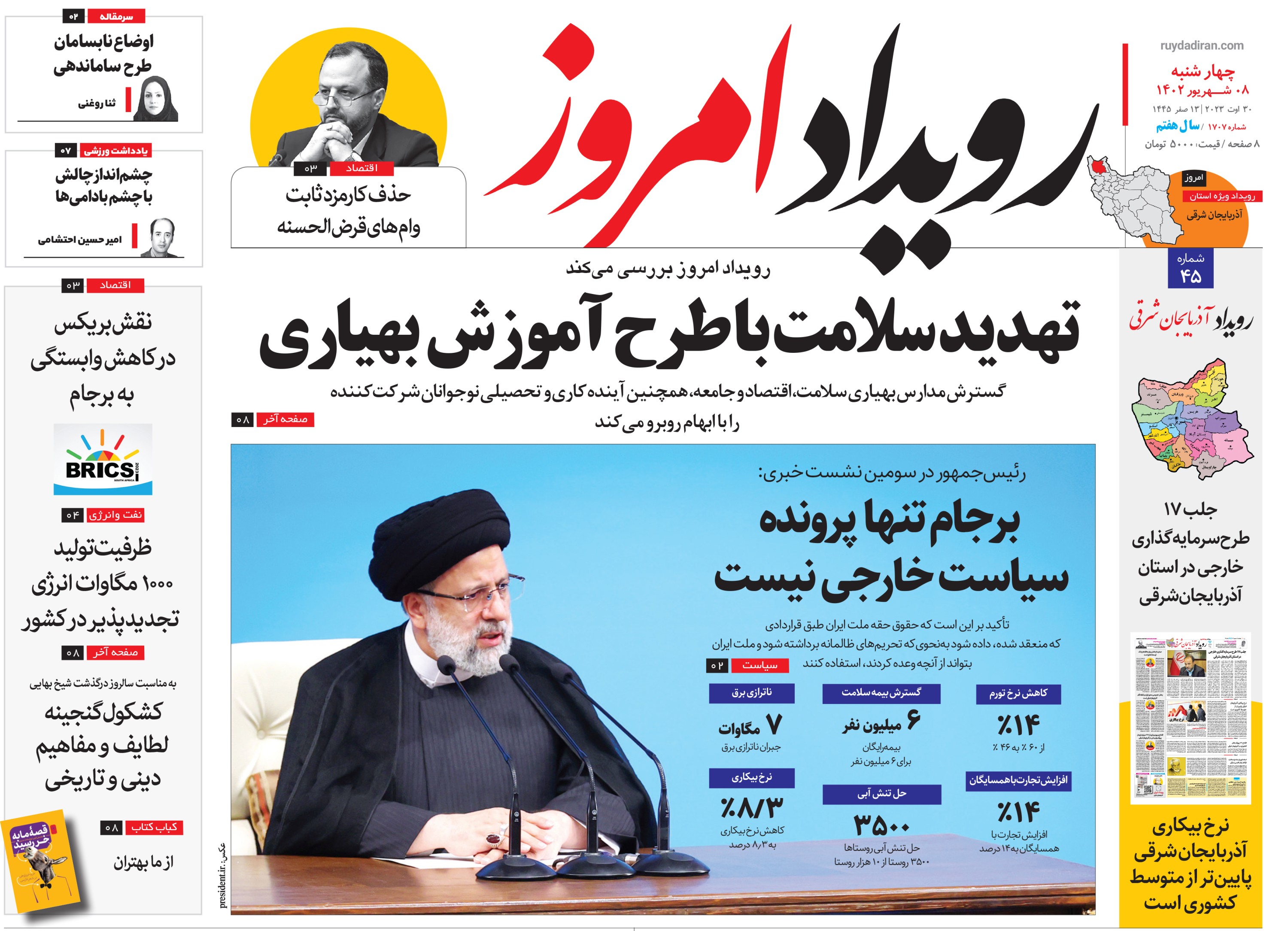 کد: 237341 | 08 شهریور 1402 ساعت 00:00 روزنامه رویداد امروز چهارشنبه ۸ شهریور ۱۴۰۲ اشتراک گذاری گزارش خطا × اشتراک گذاری مطلب: روزنامه رویداد امروز چهارشنبه ۸ شهریور ۱۴۰۲ فیسبوک اینستاگرام تلگرام ایکس (توییتر) ایتا بله روبیکا × گزارش خطا برای گزارش خطا با پست الکترونیکی: ruydadiran[at]gmail.com در ارتباط باشید