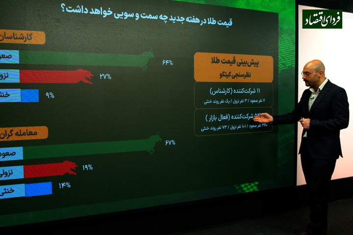 در این میان آنگونه که تازهترین نظرسنجی هفتگی کیتکو نشان میدهد از ۱۱ کارشناس شرکتکننده، ۷ نفر در انتظار صعود قیمت طلا، ۳ نفر کاهش و تنها یک نفر روندی خنثی را برای این فلز ارزشمند انتظار دارند. همچنین از ۵۳۴ فعال بازار شرکت کننده در این نظرسنجی، ۶۷ درصد روند صعودی، ۱۹ درصد روند نزولی و ۱۴ درصد روندی خنثی را برای طلای جهانی پیشبینی میکنند.