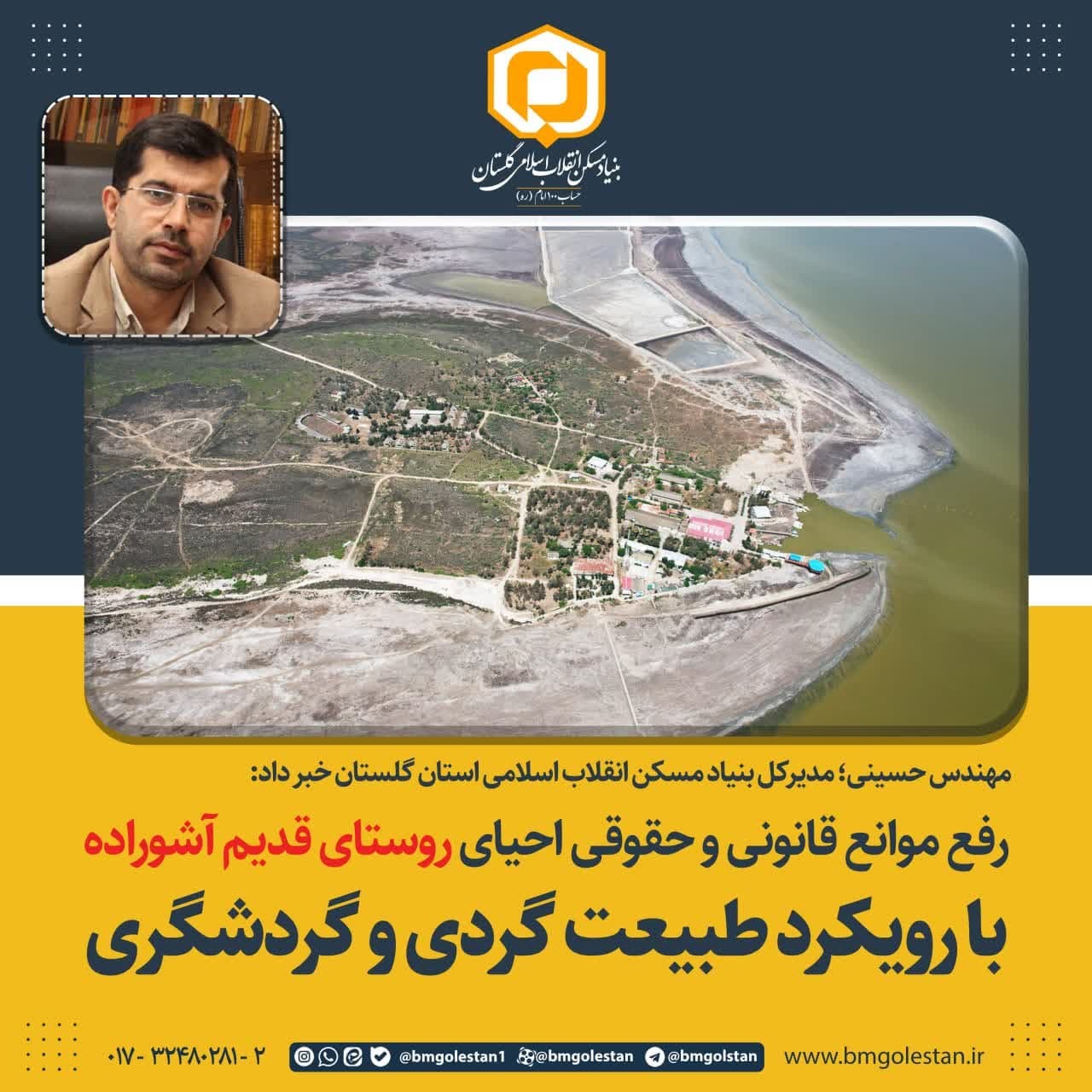 وی افزود: در دهه ۷۰ بر اثر بالا آمدن و پیشروی آب دریا مردم جزیره آشوراده مجبور به ترک منازل خود شده و با تدبیر بنیاد مسکن، در اراضی در اختیار بنیاد در شهر بندرترکمن مستقر شدند و اراضی زیر آب رفته خود را به بنیاد مسکن واگذار کردند که متاسفانه در سنوات قبل کل اراضی روستا ملی اعلام گردید و عملاً باعث عدم اجرای دو طرح مهم استان، احیای روستای قدیم و اجرای طرح طبیعت گردی شده بود که با پیگیری های استاندار محترم در سفر ریاست جمهور به استان و بعد از آن پیگیریهای رئیس کل دادگستری استان در سفر ریاست محترم قوه قضاییه به استان و ارائه مدارک و مستندات مثبته لازم توسط بنیاد مسکن استان به مرجع قضایی و برگزاری جلسات مستمر بین دستگاهی و پیگیریهای حضرت آیت الله نورمفیدی، نماینده معزز ولی فقیه در استان، در نهایت موانع حقوقی این طرح با نظر قضات محترم، رئیس کل دادگستری و دادستان مرکز استان مرتفع و موانع قانونی این طرح مهم هم با پیگیریهای استاندار محترم از طریق سازمان محیط زیست کشور رفع گردید.