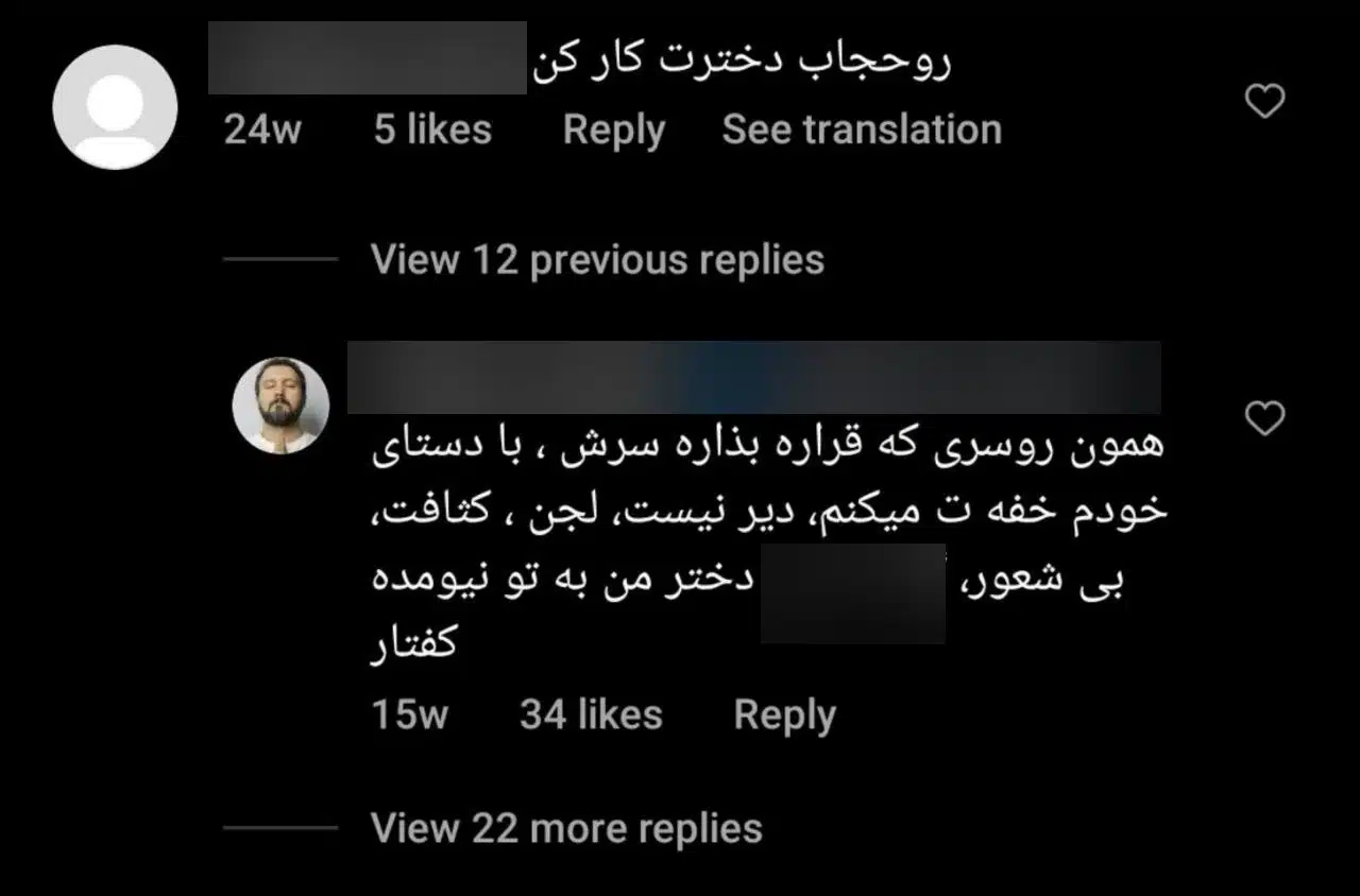 کامبیز دیرباز به تذکر حجاب به دخترش در اینستاگرام به تاریخ اسفند سال 1401 واکنش نشان داد که در ادامه مشاهده می کنید: