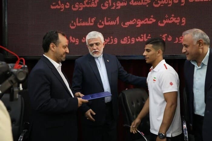 سیداحسان خاندوزی وزیر امور اقتصادی و دارایی در حاشیه نشست شورای گفت‌وگوی دولت و بخش خصوصی استان گلستان به میزبانی گنبدکاووس از «مهدی الفتی» ورزشکار گلستانی مدال‌آور بازی‌های آسیایی «هانگژو» تجلیل کرد.