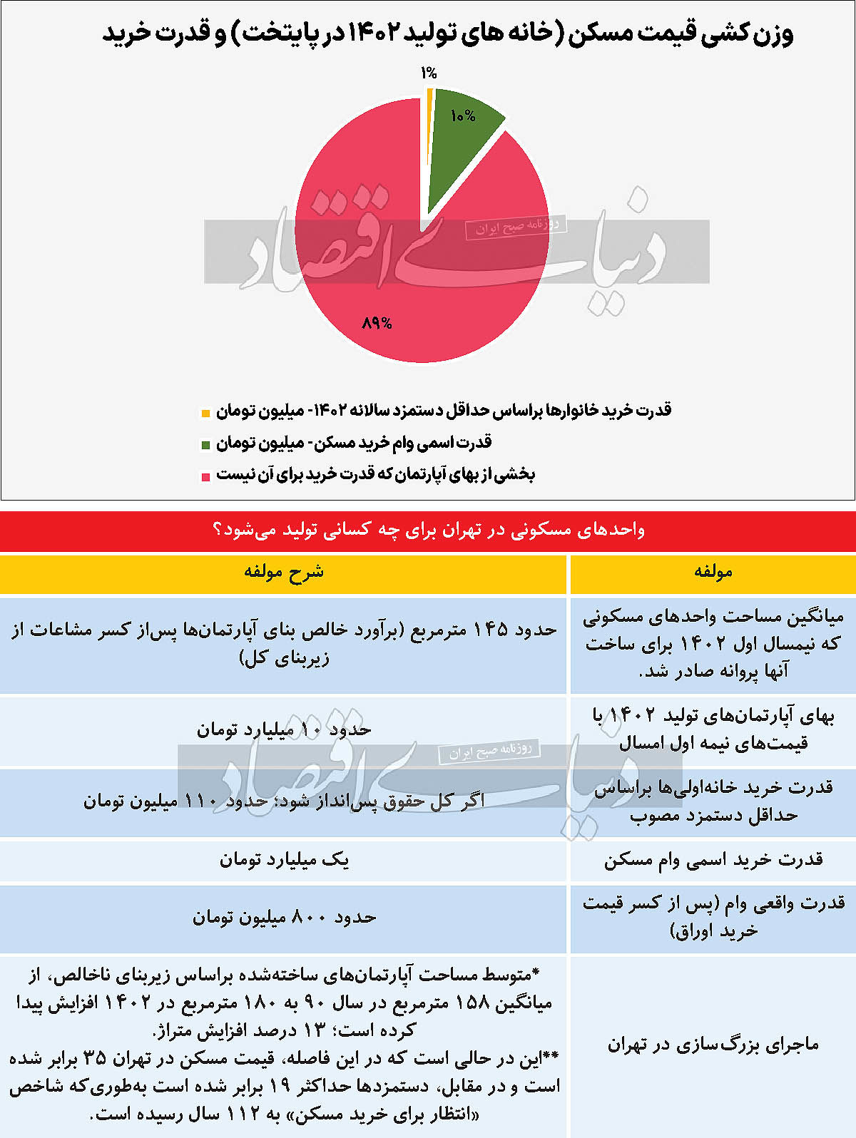 یک واحد آپارتمان 140 تا 150 مترمربعی در تهران در حقیقت یک واحد سه خوابه است که اگرچه می‌تواند گزینه مطلوب سکونت هر شهروندی در پایتخت به شمار بیاید، اما تناسبی با قدرت خرید عموم متقاضیان مسکن ندارد. تا پاییز سال گذشته که آمار رسمی از نبض معاملات و قیمت مسکن در تهران منتشر می‌‌‌شد، میانگین مساحت خانه‌‌‌های معامله‌شده در پایتخت حدود 90 مترمربع برآورد می‌‌‌شد و در این بین سهم معاملات واحدهای تا 60 مترمربع از کل معاملات مسکن به مراتب از دیگر گروه‌‌‌های متراژی بیشتر بود.
