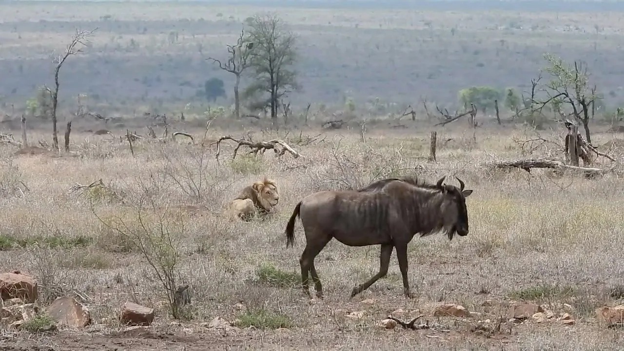 یک شیر نر بالغ که در حیات ماسایی مارا که مشغول استراحت بود، یک کل یالدار از کنارش عبور کرد. اما به خودش زحمت نداد تا این طعمه در دسترس را شکار کند. در آن سو کل یالدار هم که فهمیده بود، شیر قصد حمله کردن ندارد، به آرامی و بدون ترس از کنارش گذشت.