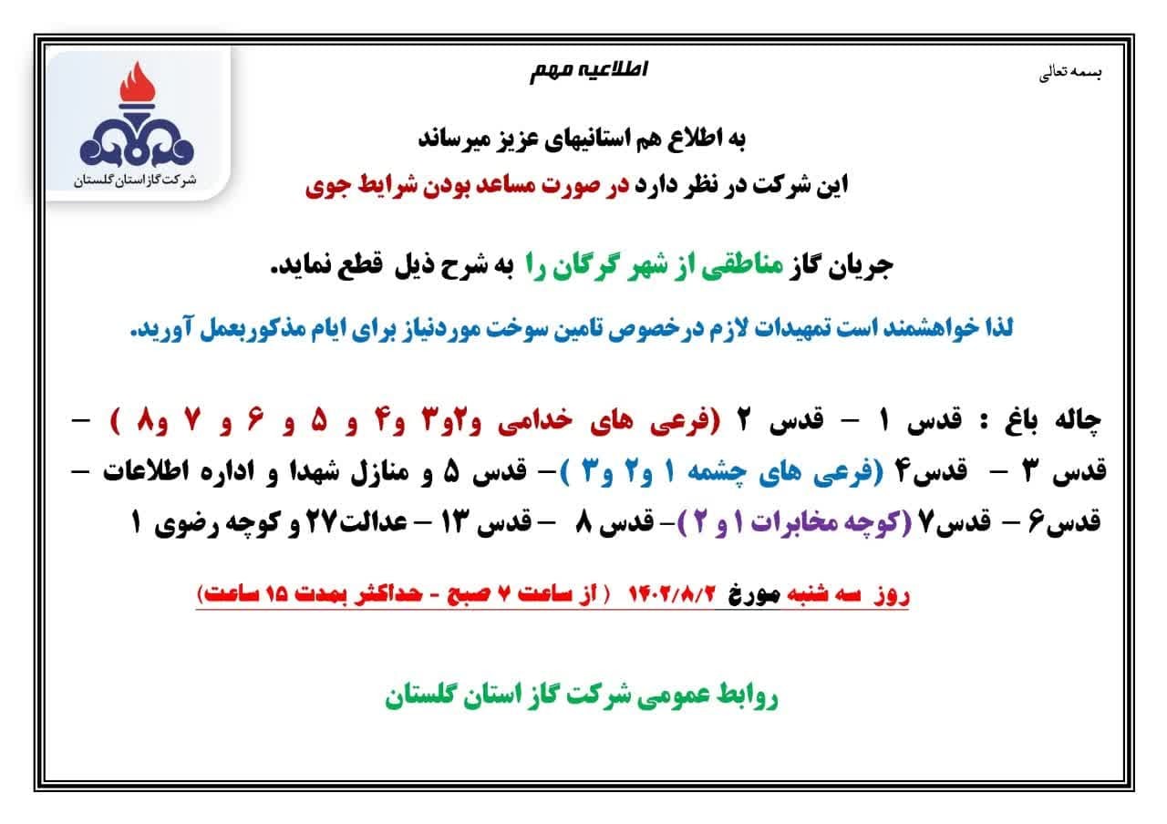 در صورت مساعد بودن شرایط جوی جریان گاز مناطقی از شهر گرگان را به شرح ذیل قطع نماید
