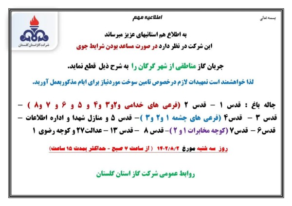 به اطلاع هم استانیهای عزیز میرساند ، این شرکت در نظر دارد در صورت مساعد بودن شرایط جوی جریان گاز مناطقی از شهر گرگان را به شرح ذیل قطع نماید.