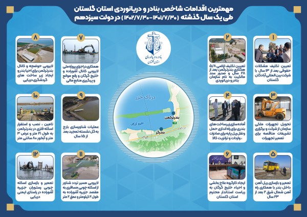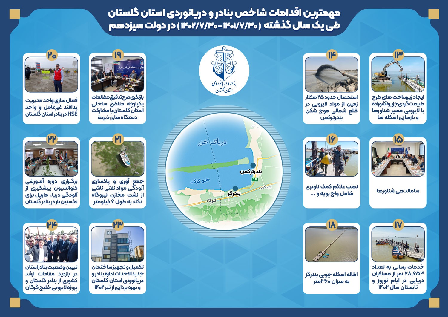 اینفوگرافی/ مهمترین اقدامات شاخص بنادر و دریانوردی استان گلستان طی یک سال گذشته از تاریخ ۱۴۰۱/۰۷/۳۰ الی۱۴۰۲/۰۷/۳۰ در دولت سیزدهم