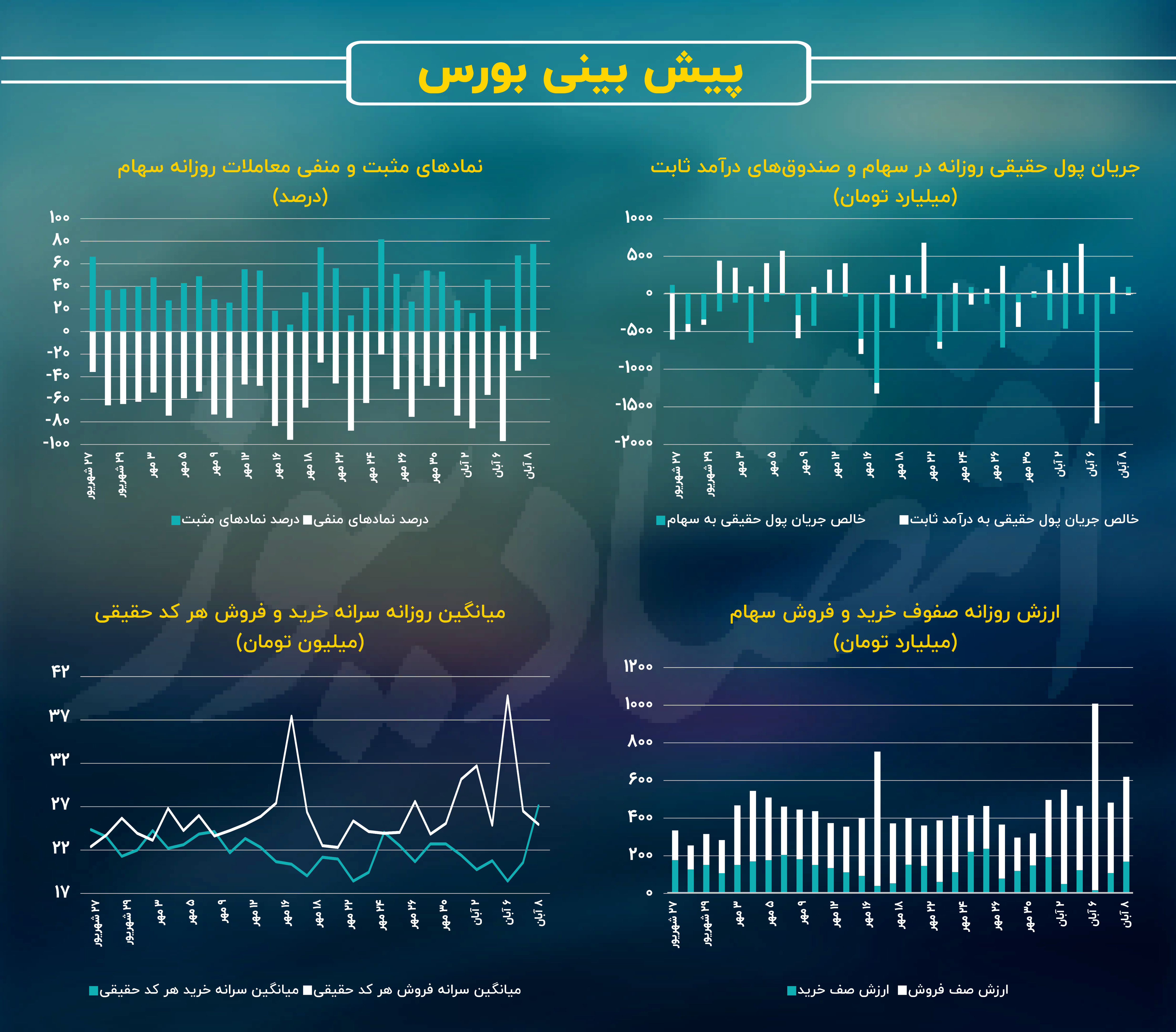 با این منوال پیش بینی میشود که بازار سهام امروز ارزش معاملات خردی در سطح 3 تا 5 همتی داشته باشد. بورس تهران احتمالاً معاملات امروز را با رشد تراز ضعیف شاخصهای اصلی آغاز کند. احتمال بازدهی مثبت شاخصهای اصلی بازار سهام و عملکرد بهتر شاخص کل هموزن به نسبت شاخص کل در انتهای معاملات امروز بالا است. جریان پول حقیقی در سهام برای معاملات امروز مثبت و مشابه روز دوشنبه پیش بینی میشود. صفوف خرید سهام اندکی افزایش مییابد و در سمت صفوف فروش سهام نیز احتمال رشد اندکی وجود دارد. احتمالاً در انتهای معاملات امروز سرانه خرید هر کد حقیقی در سطح 24 میلیون تومانی قرار گیرد و سرانه فروش نیز در بالای 21 میلیون تومان قرار گیرد. فرابورس تهران احتمالاً رشد تراز بیشتری در شاخصهای اصلی خود به نسبت بورس داشته باشد؛ اما احتمالاً شکاف بازدهی در بین شاخص کل و هموزن بورس و فرابورس کاهش یابد.