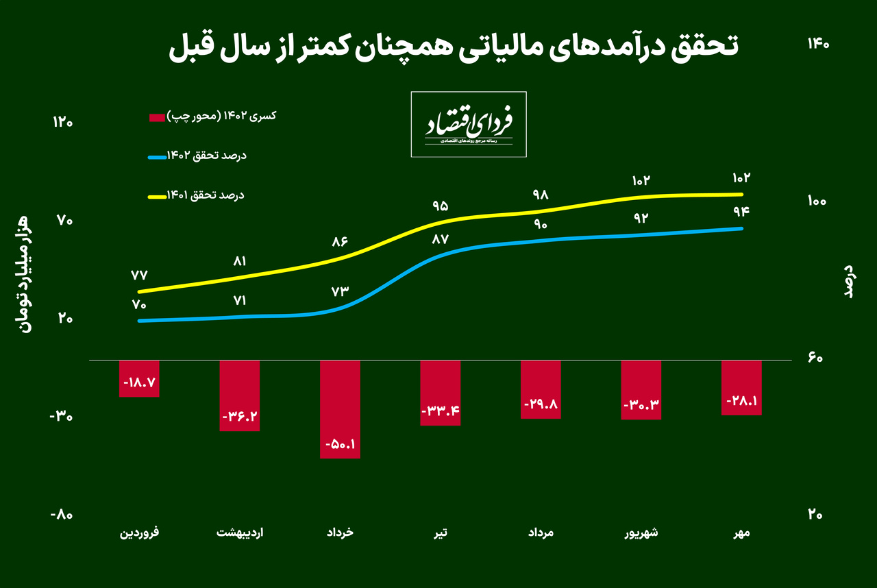 آمارهای سازمان امور مالیاتی نشان میدهند که در هفت ماهه اول سال ۱۴۰۲ حدود ۴۰۹ همت (هزار میلیارد تومان) درآمد مالیاتی کسب شده که حدود ۱۴۸ همت از آن مربوط به مالیات غیرمستقیم و ۲۶۰.۵ همت از آن مربوط به مالیات مستقیم بوده است. عدد بدست آمده در این دوره نسبت به مقدار مصوب در بودجه تحقق ۹۴ درصدی را نشان میدهد که هرچند بالاترین مقدار در سال جاری میباشد، اما همچنان حدود ۲۸ همت کسری را نشان میدهد. این در حالی است که سال گذشته در این دوره تحقق درآمدهای مالیاتی بیش از ۱۰۲ درصد بود. با توجه به اینکه درآمدهای مالیاتی در سال ۱۴۰۲ حدود ۶۵ درصد نسبت به سال قبل افزایش یافته، طبیعی بود که بخشی از این درآمدها طی سال محقق نشود و بایستی دید که آیا در ادامه سال روند صعودی تحقق درآمدهای مالیاتی باعث دریافت کامل مبالغ مالیات در نظر گرفته شده خواهد شد.