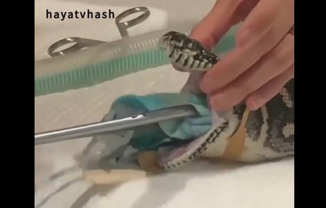 (ویدیو) بیرون کشیدن باور نکردنی پتو از دهان مار غول پیکر