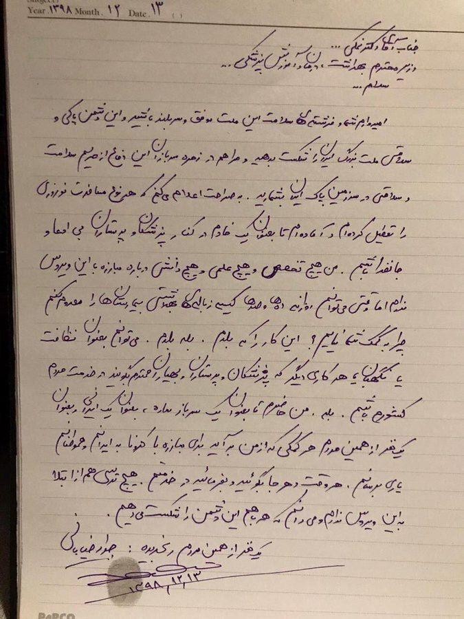 امیدوارم شما و فرشته های نجات این ملت موفق و سربلند باشید و این دشمن پاکی و سلامتی ملت بزرگ ایران را شکست بدهید و مرا هم در زمره سربازان این دفاع از حریم سلامت و سلامتی در سرزمین پاک ایران بشمارید . به صراحت اعلام میکنم که هر نوع مسافرت نوروزی را تعطیل کردهام و آمادهام تا به عنوان یک خادم در کنار پزشکان و پرستاران بی ادعا و جانفدا باشم . من هیچ تخصص و هیچ علمی و هیچ دانشی درباره مبارزه با این ویروس ندارم اما وقتی میتوانم روزانه دهها و صدها کیسه زبالههای بهداشتی بیمارستانها را معدوم کنم چرا به کمک شما نیایم؟ این کار را که بلدم. بله بلدم. میتوانم بعنوان نظافت یا نگهبان یا هر کاری دیگر که پزشکان و پرستاران و بهیاران محترم بگویند در خدمت مردم کشورم باشم. بله. من حاضرم تا به عنوان یک سرباز ساده، به عنوان یک ایرانی و به عنوان یک نفر از همین مردم هر کمکی که از من برآید برای مبارزه با کرونا به ایرانم و هموطنانم یاری برسانم. هر وقت و هر جا بگویید و بفرمایید در خدمتم. هیچ ترسی هم از ابتلا به این ویروس ندارم و میدانم که همه با هم این دشمن را شکست میدهیم.
