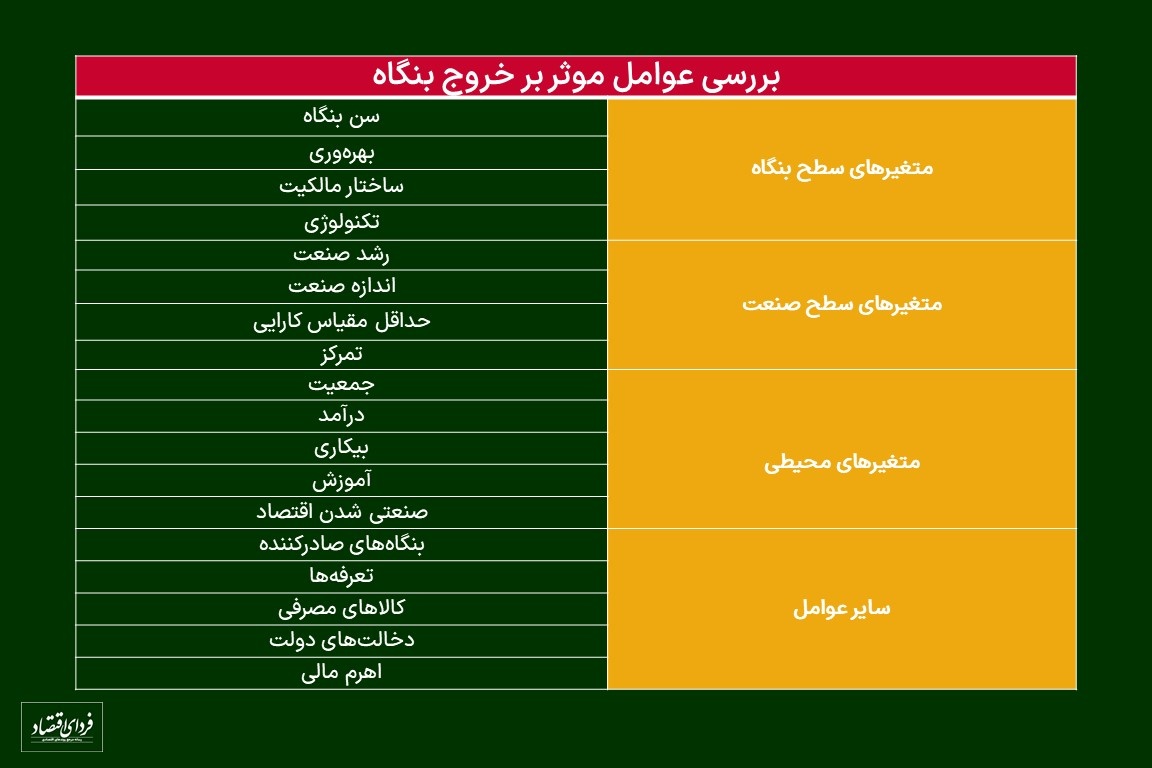 بر اساس گزارشی که از سوی مجله اقتصادی وزارت اقتصاد منتشر شده، ورود و خروج بنگاهها از سه طریق بر عملکرد بازارهای صنعتی تاثیر میگذارد. اول اینکه؛ ورود و خروج بنگاهها از طریق افزایش رقابت در بازار موجب کاهش قیمتها و سودآوری بنگاههای موجود در صنعت میشود. دوم؛ طی فرآیند ورود و خروج، بنگاههای با بهرهوری پایین از صنعت خارج و بنگاههای با بهرهوری بالا جایگزین آنها میشود. سوم؛ ورود بنگاههای جدید به صنعت عمدتا موجب ورود تکنولوژی برتر به صنعت شده و بنگاههای فاقد نوآوری از صنعت را خارج میکنند. عوامل موثر بر خروج بنگاهها را در «متغیرهای سطح بنگاه»، «متغیرهای سطح صنعت»، «متغیرهای محیطی»، و «سایر عوامل» مطابق جدول پیوست میتوان طبقهبندی کرد.