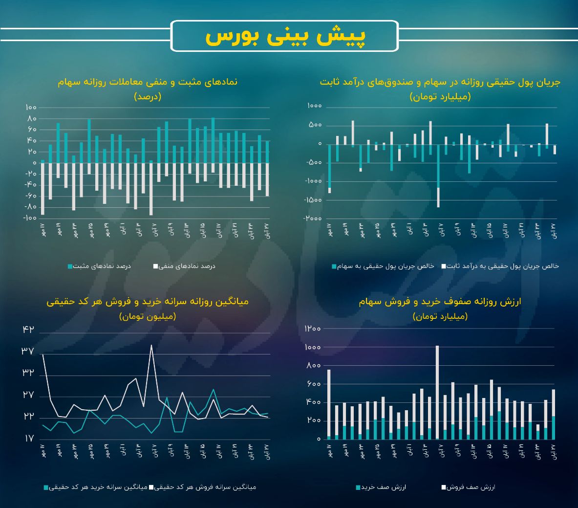 با این منوال پیش بینی میشود که بازار سهام امروز ارزش معاملات خردی در سطح 3 تا 5 همتی داشته باشد. بورس تهران احتمالاً معاملات امروز را با افت تراز ضعیف شاخصهای اصلی آغاز کند. احتمال بازدهی منفی شاخصهای اصلی بازار سهام و عملکرد بهتر شاخص کل هموزن به نسبت شاخص کل در انتهای معاملات امروز بالا است. جریان پول حقیقی در سهام برای معاملات امروز منفی ولی اندک پیش بینی میشود و خروج پول حقیقی از صندوقهای درآمد ثابت تداوم خواهد داشت. صفوف خرید سهام اندکی کاهش مییابد و در سمت صفوف فروش سهام نیز احتمال افزایش اندکی وجود دارد. احتمالاً در انتهای معاملات امروز سرانه خرید هر کد حقیقی در سطح 23 میلیون تومانی قرار گیرد و سرانه فروش نیز در بالای 22 میلیون تومان قرار گیرد. فرابورس تهران احتمالاً ریزش تراز کمتری در شاخصهای اصلی خود به نسبت بورس داشته باشد؛ اما احتمال شکاف بازدهی در بین شاخص کل و هموزن فرابورس کاهش یابد.