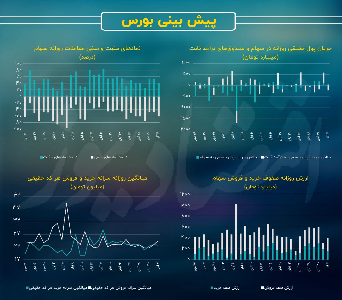 با این منوال پیش بینی میشود که بازار سهام امروز ارزش معاملات خردی در سطح 3 تا 6 همتی داشته باشد. بورس تهران احتمالاً معاملات امروز را با رشد تراز شاخصهای اصلی آغاز کند. احتمال بازدهی مثبت شاخصهای اصلی بازار سهام و عملکرد بهتر شاخص کل هموزن به نسبت شاخص کل در انتهای معاملات امروز بالا است. جریان پول حقیقی در سهام برای معاملات امروز مثبت ولی اندک پیش بینی میشود و خروج پول حقیقی از صندوقهای درآمد ثابت تداوم خواهد داشت. صفوف خرید سهام اندکی افزایش مییابد و در سمت صفوف فروش سهام نیز احتمال کاهش اندکی وجود دارد. احتمالاً در انتهای معاملات امروز سرانه خرید هر کد حقیقی در سطح 23 میلیون تومانی قرار گیرد و سرانه فروش نیز در بالای 22 میلیون تومان قرار گیرد. فرابورس تهران احتمالاً رشد تراز بیشتری در شاخصهای اصلی خود به نسبت بورس داشته باشد؛ اما احتمال شکاف بازدهی در بین شاخص کل و هموزن فرابورس کاهش یابد.