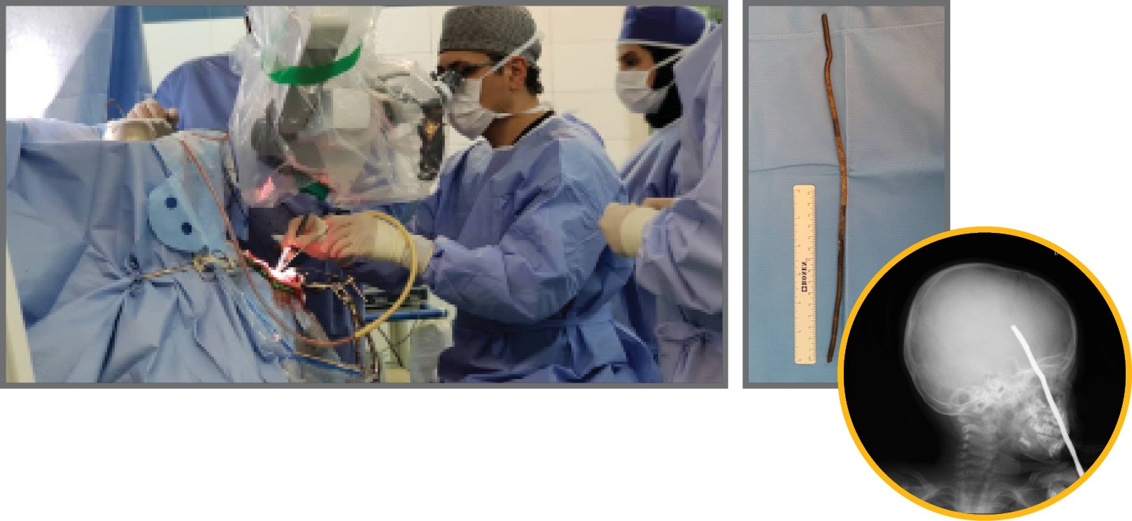 دکتر علیرضا طبیبخویی، سرپرست تیم جراحی مغز و اعصاب بیمارستان رسول اکرم(ص) درباره شرایط کودک هنگام انتقالش به بیمارستان میگوید: «ساعت 11شب کودک به بیمارستان رسید. میله آهنی به قطر 6میلیمتر از زیر چشم راست به طول 8سانتیمتر وارد جمجمه و مغز کودک شده بود. در این شرایط باید همه موارد بهطور دقیق بررسی میشد. بعد از انجام آنژیوگرافی معلوم شد میله آهنی در محل خیلی حساسی قرار دارد. در مغز 2شریان هلالیشکل قرار دارد که میله درست در بین این 2شریان قرار گرفته بود. کافی بود نوک میله به یکی از شریانها برخورد کند تا پسربچه فلج یا حتی منجر به از دست دادن جان او شود. از سویی میله از چشم پسربچه عبور کرده بود اما اولویت مغز و زنده ماندن او بود. به همین دلیل مقدمات انجام جراحی مغز انجام شد.»