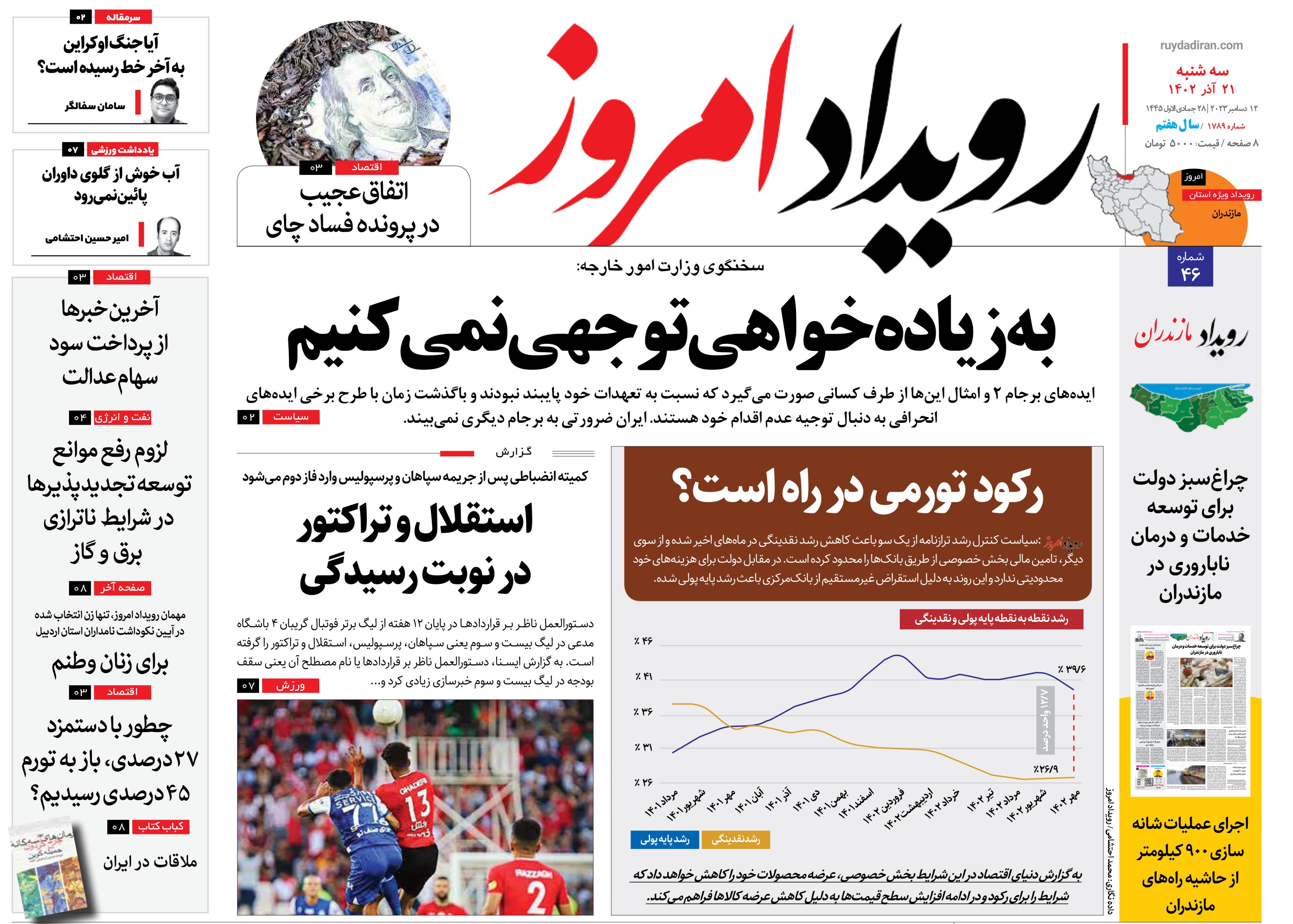 کد: 276881 | 21 آذر 1402 ساعت 00:00 روزنامه رویداد امروز سه شنبه ۲۱ آذر ۱۴۰۲ اشتراک گذاری گزارش خطا × اشتراک گذاری مطلب: روزنامه رویداد امروز سه شنبه ۲۱ آذر ۱۴۰۲ فیسبوک اینستاگرام تلگرام ایکس (توییتر) ایتا بله روبیکا × گزارش خطا برای گزارش خطا با پست الکترونیکی: ruydadiran[at]gmail.com در ارتباط باشید