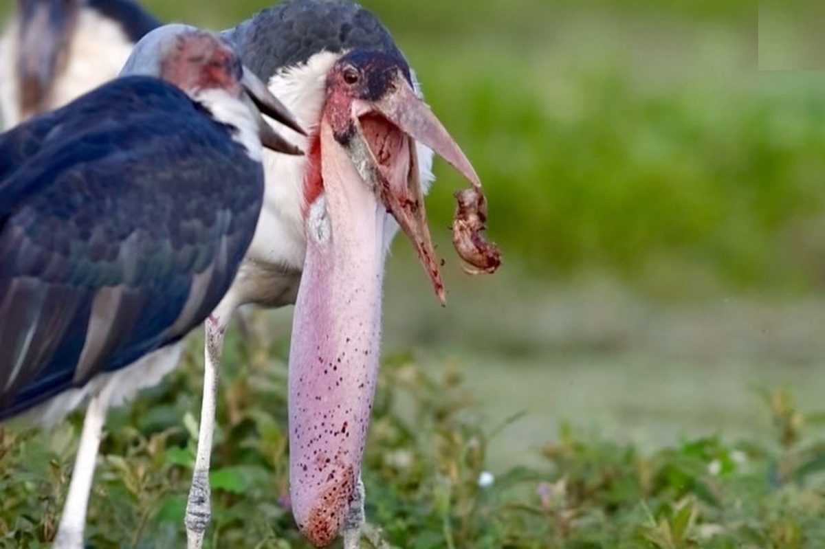 یک لکلک مارابو پس از بلعیدن لاشه یک گوزن یالدار به این وضع درآمده است. با این وجود لک لک به ادامه خورد ادامه میدهد. این ویدئو در حیات وحش تانزانیا فیلمبرداری شده است. لکلک مردارخوار یا لکلک مارابو نام یک گونه از سرده لکلکهای گرمسیری است. بسیاری از مردم این پرنده را زشتترین پرنده دنیا میدانند. لکلکهای مارابو سر و گردن بیموی صورتی رنگ دارند، غبغب بیپر که دارای توانایی بادکردن دارد نیز از زیر نوک آنها آویزان است./فرارو
