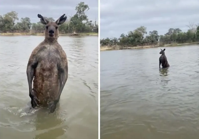 ماه اکتبر، مردی ویدیویی از کانگورویی گرفت که سعی داشت یک سگ خانگی را غرق کند. پس از اینکه این کانگوروی خاکستری نر شرقی (Macropus giganteus) سر هاچی را زیر آب نگه داشت، میک مولونی (صاحب سگ) مجبور شد سگش هاچی را از رودخانه موری در ویکتوریای استرالیا نجات دهد. مولونی توانست هاچی را نجات دهد اما به خاطر تلاشهایش از کانگورو یک مشت خورد. این نخستین باری نیست که کانگوروها با سگها اینگونه رفتار میکنند. احتمالاً این جانور کیسهدار فقط به دنبال امنیت خودش بوده است. کانگوروها یاد گرفتهاند برای دفاع از خودشان در برابر حملات سگها، به درون آب بپرند.